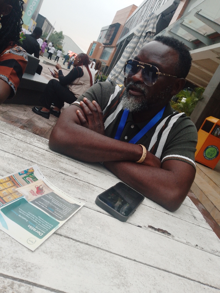 The scene depicts an outdoor urban environment, reportedly in Alaguntan, Nigeria. A dark-skinned adult male occupies the foreground-right, seated at a distressed white-painted wooden plank table. He presents with a short dark haircut and a prominent grey beard, wearing large, dark aviator-style sunglasses with gold-colored frames. His attire consists of a dark green polo shirt featuring white and brown striped cuffs and collar. A blue lanyard is visible around his neck. His arms are crossed, resting on the table, and a gold-colored band is observed on his right wrist. On the table to the foreground-left, a dark-colored smartphone, cased, is positioned face down. Adjacent to it are multiple folded paper leaflets, one displaying "Deratin Supp" and images of packaged goods. In the mid-ground-left, part of a dark-skinned individual with braided hair, wearing a patterned orange and brown garment, is visible. Further into the mid-ground and background, several individuals are present, some seated, others standing or moving. The background reveals contemporary multi-story buildings with dark glass facades, an advertising banner with "Opay" displayed vertically, and an overhead striped awning. Greenery is present between structures. To the far right, two yellow public waste receptacles, marked with "USE TRASH BOX" and recycling symbols, are situated.