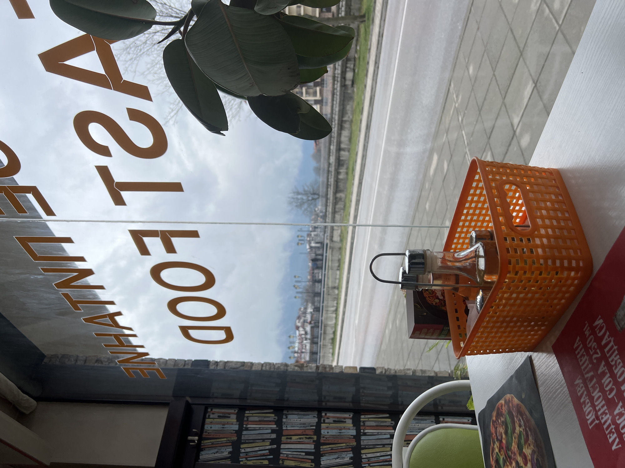The image depicts an interior view from a restaurant or cafe in Bansko, Bulgaria, looking out through a large glass window onto an urban street scene on an overcast day. In the immediate foreground, a white table is visible, featuring an orange plastic condiment basket containing three bottles/shakers, likely for oil, vinegar, and seasonings. To the left, a menu or flyer displays a pizza image. Beneath this, a red menu card is partially visible, showing text in Bulgarian which translates to "ADD ICE-COLD COCA-COLA 250ML" and "LUNCH YOURSELF" or "ORDER LUNCH." A light green chair with a white frame is partially visible on the left. To the far left, a decorative panel designed to resemble a bookshelf is present. A large-leafed houseplant (possibly a Ficus elastica) partially obstructs the view on the right side of the window. Reflected on the window glass, orange adhesive lettering, reversed, clearly spells "FAST FOOD." The exterior view reveals a two-lane asphalt road, which appears damp or wet, running parallel to the building. A white dividing line is visible on the road. Adjacent to the road is a tiled pedestrian sidewalk. Beyond the sidewalk, a low concrete barrier or retaining wall separates the road area from further ground and distant structures. In the background, across what appears to be a bridge structure or elevated section of road, buildings with light-colored roofs are visible. Behind these structures, a range of mountains is present, partially obscured by an overcast sky. Bare deciduous trees are scattered in the mid-ground. No individuals are visible in the scene.