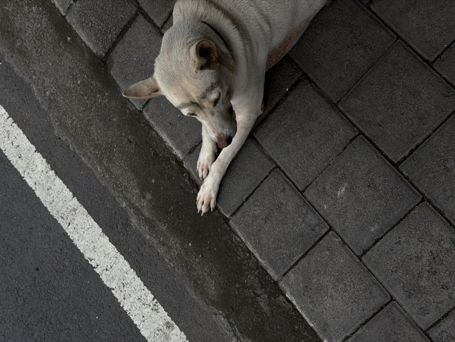 From an overhead perspective, a light-colored dog rests on gray, rectangular pavers. Its head is angled downwards, with its paws crossed. The dog's fur is a muted tone. The left side of the image shows a dark asphalt surface with a thick, white line along a curb. The pavers are arranged in a diagonal pattern. The overall tone is neutral, with subdued lighting emphasizing the textures of the pavers and asphalt.