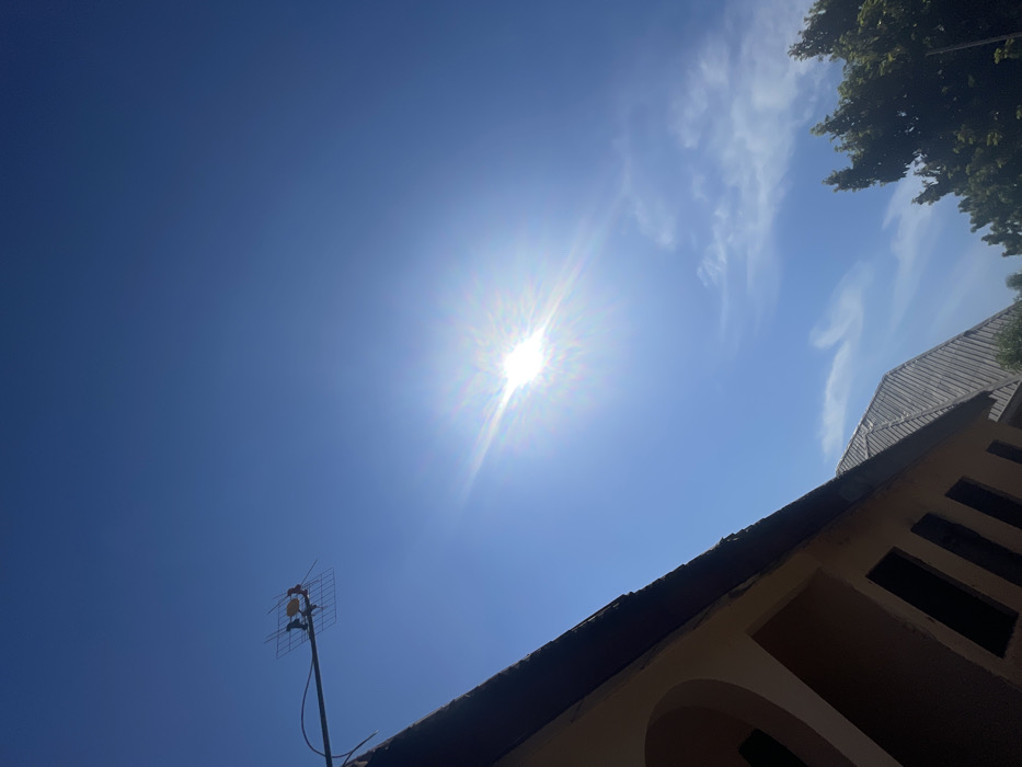 The image depicts an outdoor scene in Bukuru, Nigeria, under a clear, bright blue sky with scattered wispy white clouds. The sun, appearing intensely bright with a distinct starburst effect, is positioned in the upper right quadrant of the frame. In the upper left, an outdoor television antenna, consisting of multiple metallic elements on a pole, is silhouetted against the sky. The dark, shadowed edge of a building's roof occupies the left and bottom-left portion of the frame, below which a light-colored wall with dark, arched openings is partially visible. Further back, a second building with a light grey, possibly corrugated, roof is discernible. Dense green tree foliage is visible along the right edge of the frame, partially silhouetted. No people, discernible actions, or interactions are visible.