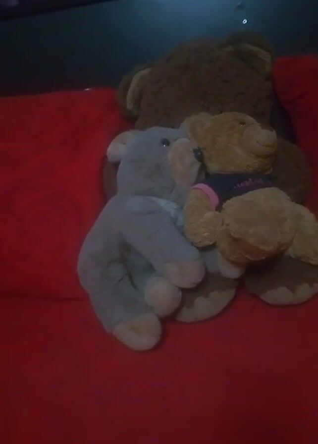 three stuffed bears on a red surface. A large brown bear is in the background. A smaller tan bear wearing a dark blue shirt with pink trim is leaning against the larger bear. A grey bear is sitting next to the tan bear, also leaning against the larger bear. The bears are arranged as if they are cuddling or hugging each other. A headboard and a curtain are visible in the background.