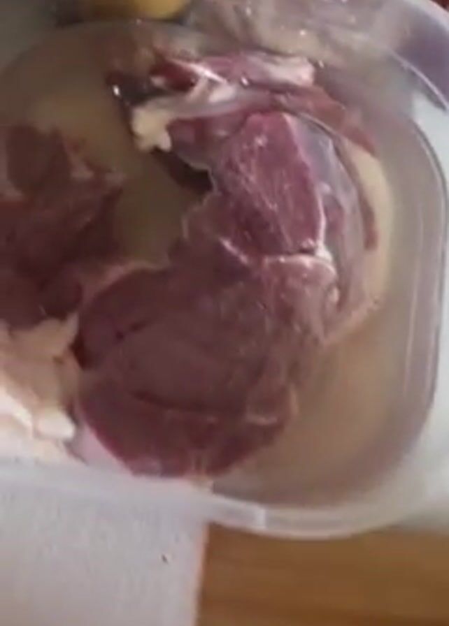 ingredients for a meal preparation. A clear plastic container holds raw meat submerged in water. On a wooden cutting board, there are two peeled potatoes and a peeled onion. The environment appears to be a kitchen.