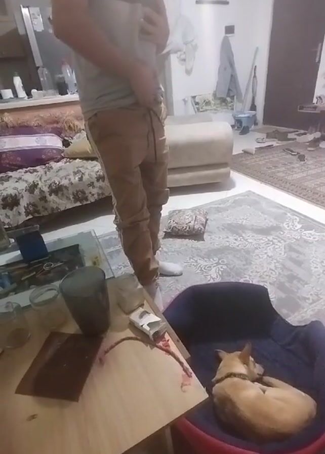 man standing in a room while holding a phone. He is wearing a striped t-shirt, khaki pants, and white socks. The room appears to be cluttered, with various items scattered on the floor and a table. There is a dog asleep in a bed near the table. The man seems to be filming himself, moving the camera slightly.