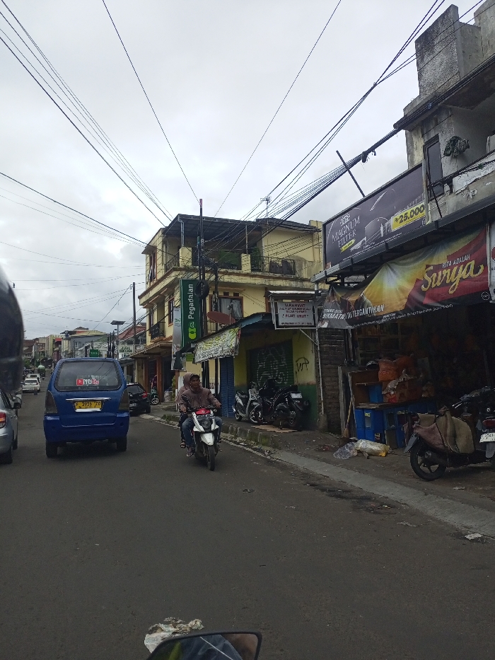 An overcast street scene shows a blue minivan behind a white scooter carrying two people. Shops line the right side of the street, marked with signs including "Surya" and "Magnum Filter." Parked motorbikes crowd the storefronts. Overhead, a tangle of power lines stretches across the sky. Buildings of varying heights and architectural styles occupy the background.