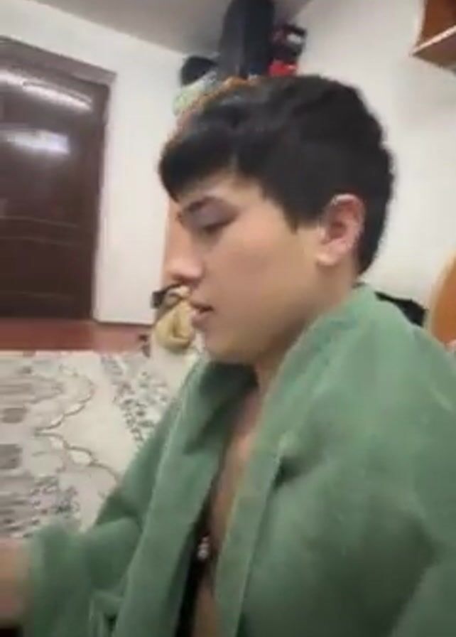 two men inside a room. Initially, a man wearing a green towel is holding a remote controller, the camera moves and shows the second man wearing a maroon shirt who seems to be talking to the first man. There are two beds, a brown wooden shelf and a closet visible in the background.