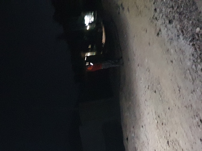 A dark, grainy image shows a dirt road or path along a dark structure. Dim light reflects off the road surface. A person or figure wearing an orange jacket is visible near a building emitting bright light in the background. The scene conveys an impression of a dimly lit, possibly rural, environment.