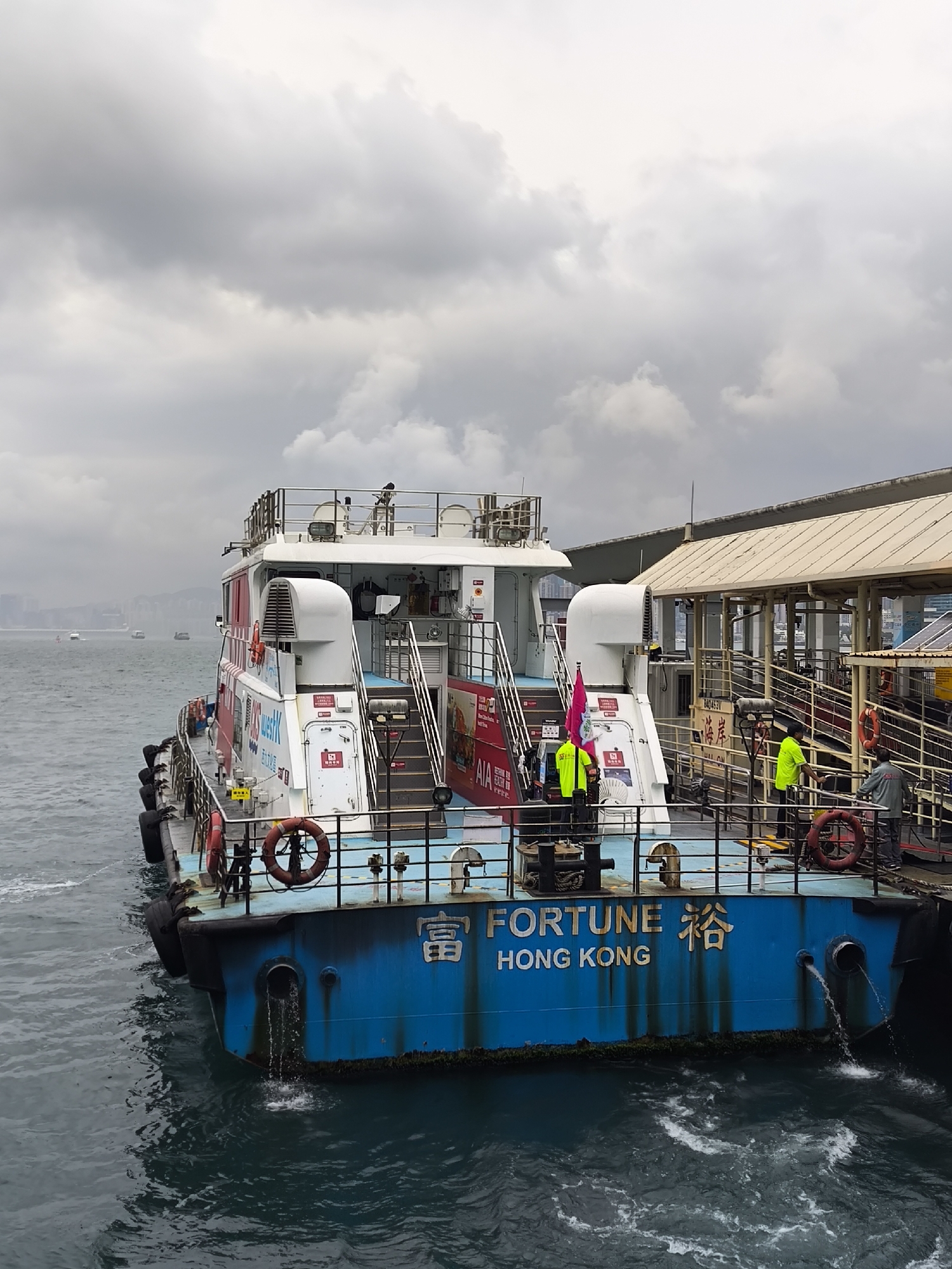 The image depicts the stern of a blue and white passenger ferry named "FORTUNE HONG KONG" (富裕) docked at a pier in Hong Kong, China, under an overcast sky. The ferry's hull is blue with a dark waterline, showing some green algae growth and rust streaks. Water is actively discharging from two pipes on the port side of the stern, creating turbulence. Several black cylindrical fenders are visible along the ferry's side. On the main deck, three individuals are present. Two individuals wear bright lime green high-visibility vests; one stands near the stern railing on the port side, and another is positioned more centrally on the main deck. A third individual, wearing a grey jacket, stands further to the starboard side of the deck, near another orange lifebuoy. The deck features metal railings and steps leading to the upper deck. Two orange lifebuoys are affixed to the stern railing. The ferry's superstructure is white with red accents and displays advertising, including "AIA" and "WeS-K". The pier structure, located to the starboard side of the ferry, has a light-colored, possibly beige, roof extending over the docking area. Gangways or ramps connect the pier to the ferry. The water in the foreground is dark and shows ripples. In the distant background, a hazy urban skyline and several other vessels are visible on the water, confirming a city harbor setting. The sky is completely covered with dense, grey clouds, indicating an overcast day.