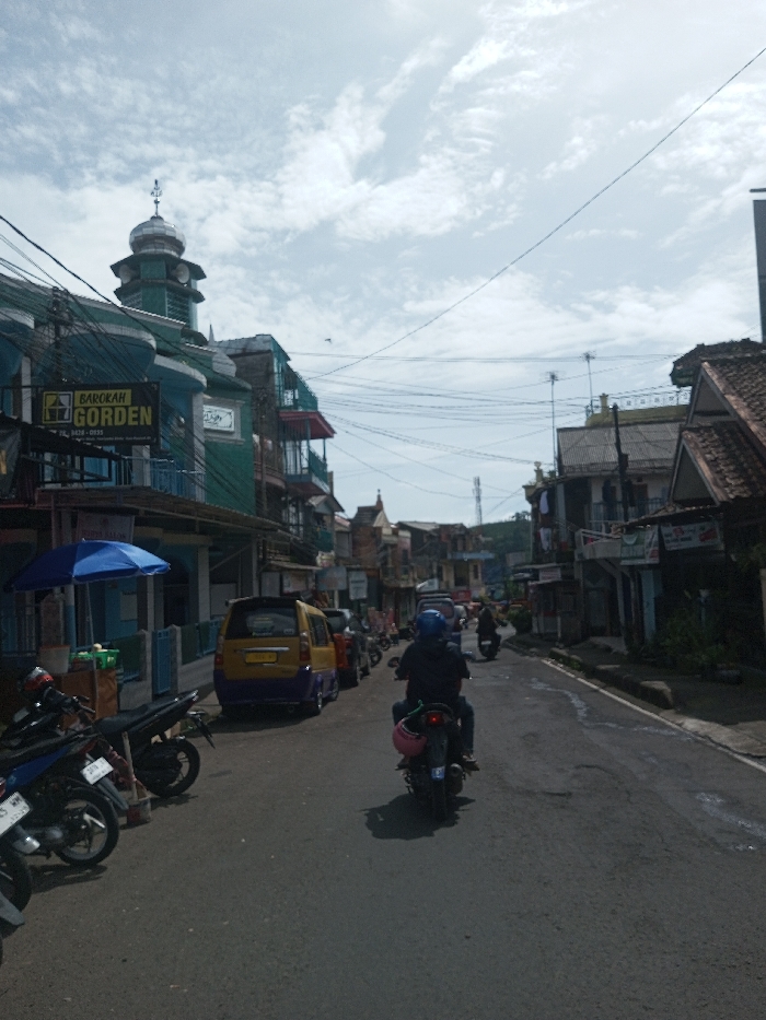 The image presents a street scene in Sandamal Eliya, Sri Lanka, observed from a pedestrian-level perspective looking down a paved road. The sky overhead is partly cloudy, displaying white and light gray cloud formations. On the left side of the street, a series of multi-story buildings stand, with the most prominent being a green structure featuring a silver dome and a minaret-like element at its apex. This green building displays a sign with "BAROKAH GORDEN" and a phone number. Below, a blue umbrella extends over an unidentifiable street vendor setup, positioned near several parked motorcycles. A yellow and purple minivan is parked further down the left side of the road. Overhead, a dense network of black utility wires traverses the scene. On the right side of the street, multi-story buildings with varied facades and roof styles, including brown tiled roofs, line the road. In the foreground and middle ground of the street, a person wearing a blue helmet and dark clothing rides a black scooter away from the viewer; a pink object is secured to the rear of the scooter. Another scooter is visible further down the road. Distant hills or mountains are discernible in the background.