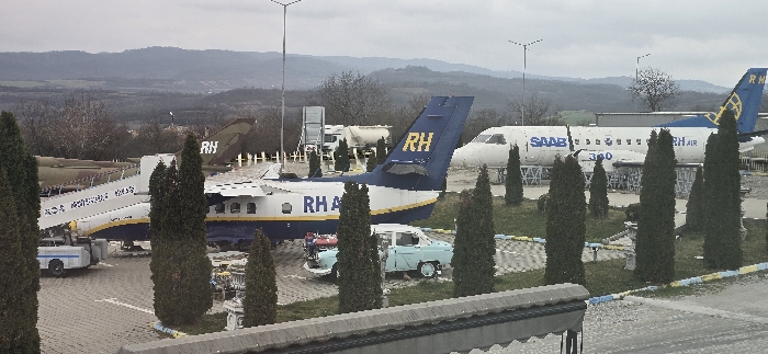 The scene depicts an outdoor aviation display area located in Kilifarevo, Bulgaria, under an overcast sky with distant rolling hills in the background. In the foreground, a low concrete wall is visible. The display area features paved surfaces with white markings, interspersed with grass plots containing numerous tall, narrow, dark green coniferous trees. Three aircraft are prominent static displays. A twin-engine turboprop, painted white and dark blue, is in the midground, marked "RH AIR" on its fuselage and with a yellow "RH" logo on its blue tail fin. To its right, another twin-engine turboprop, a white Saab 340 with "RH AIR" on its fuselage and a yellow "RH" logo on its blue tail, is positioned on elevated supports. To the far left, partially obscured, is the rear section of a camouflaged (olive drab and brown) military-style aircraft, also bearing a yellow "RH" logo on its tail. A set of white passenger steps, labeled "ДОБРИ НАРОДНИ АВИА...", abuts this camouflaged aircraft. A light blue vintage four-door sedan is parked on the paved surface between the first two described aircraft. A white ground service vehicle with a blue stripe is visible near the passenger steps of the camouflaged aircraft. In the background, behind the main aircraft displays, several trucks, including a white tanker truck, are visible. Tall light poles are distributed across the scene. No individuals are present in the image, and all subjects are static.