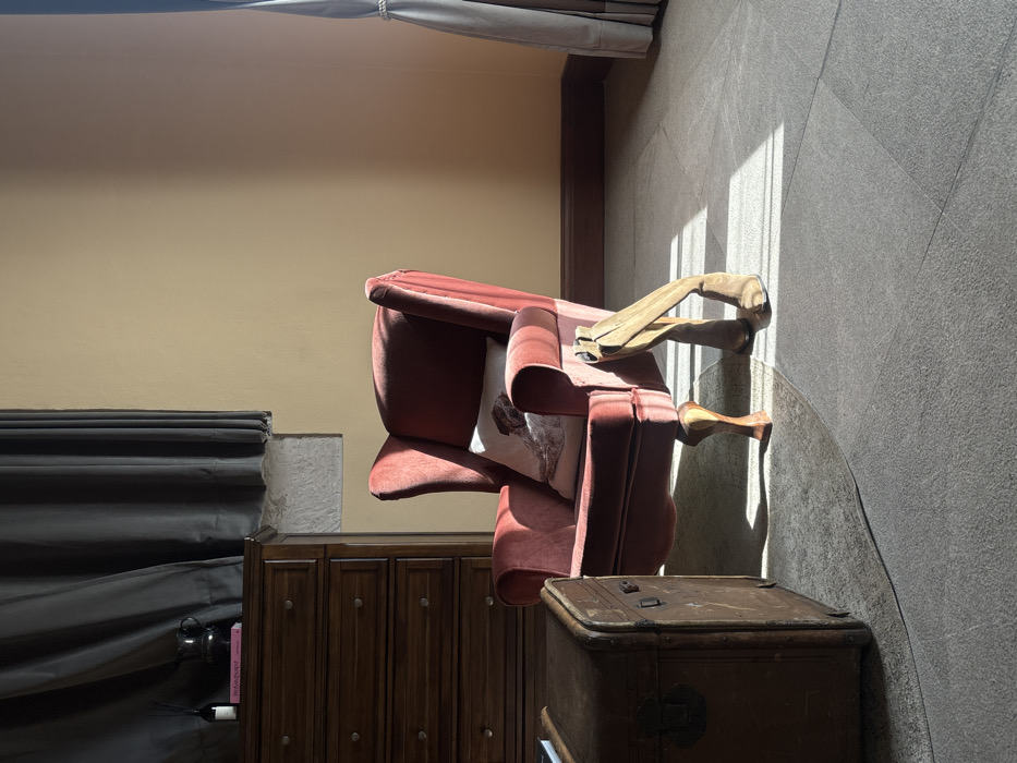 A red armchair with wooden armrests and a patterned pillow sits next to a dark wood cabinet and a rustic trunk. A closed gray shade is partially visible beside the cabinet. The floor and wall are gray, illuminated by sunlight streaming through the window. The room is rotated, with the ceiling visible on the left and the floor on the right. A tan curtain hangs along the top of the frame.