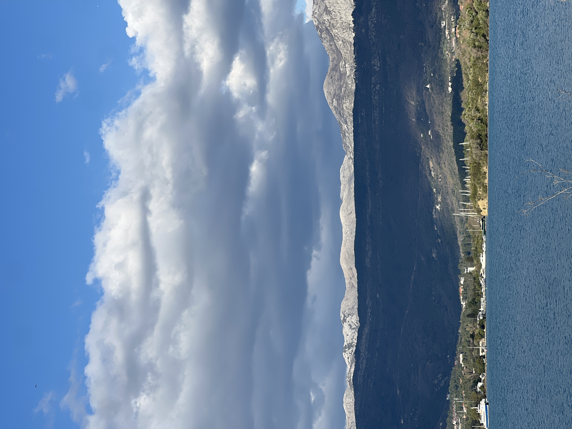 This image depicts a coastal landscape in Đuraševići, Montenegro, under a partially cloudy sky. The foreground comprises a dark blue body of water, likely a bay, with minimal surface ripples. Bare, thin branches are visible at the extreme bottom right. Immediately beyond the water lies a narrow landmass featuring green vegetation, scattered white buildings, and multiple boats docked or anchored near the shore. These include a prominent white and blue passenger vessel on the left and numerous sailboats and smaller motorboats extending to the right. A cylindrical white tower, possibly a lighthouse or communication structure, is discernible among the buildings on the right side of the coastal strip. Behind this coastal area, a dark, densely forested hill range extends across the mid-background, largely in shadow. Above and beyond these forested hills, a more distant mountain range presents rugged, light-colored peaks, partially covered with snow or pale rock. The sky occupies the upper portion of the frame. The uppermost section is clear, bright blue, with a small dark bird visible in the upper left. Below this, a large band of dense, white and grey cumulus clouds stretches across the sky, with darker grey undersides indicating shadow. The scene is illuminated by natural daylight, with direct sunlight highlighting the water, portions of the coastal strip, and the snow-capped mountain peaks, while casting the nearer forested hills into shadow. No individuals are visible.