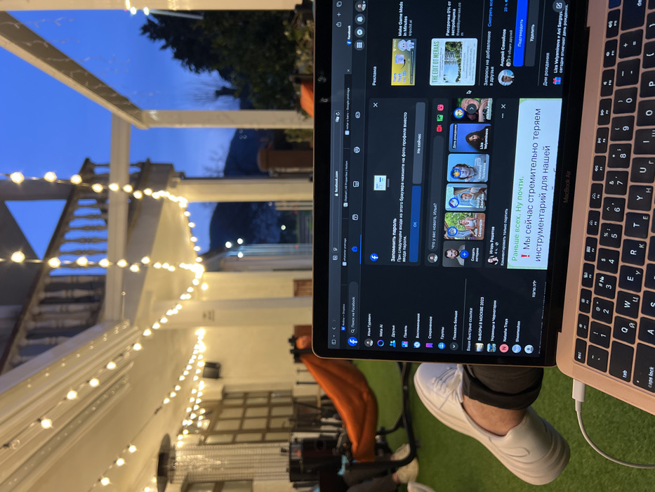 An outdoor terrace or patio in Budva, Montenegro, is depicted at dusk, illuminated by numerous strung incandescent bulbs. The scene features white neoclassical architectural elements, including columns and balustrades, set against a backdrop of mountains under a twilight sky. In the foreground, a silver/rose gold MacBook Air laptop is open, displaying the Facebook interface in dark mode with Russian text. The screen shows a prompt to "Запомнить пароль" (Remember password) and a notification partially stating "Мы сейчас стремительно теряем инструментарий для нашей" (We are rapidly losing tools for our...). A white USB-C charging cable is connected to the laptop's left side. To the left, a human leg, clad in dark trousers and a white low-top sneaker, is visible. The midground includes green artificial turf flooring. An orange fabric hammock, mounted on a dark frame, is visible to the left, with the feet of another person in white shoes discernible within it. A dark, cylindrical patio heater with a visible flame element is positioned further left. Tables and chairs are faintly visible in the background. The distant background features a blue twilight sky above silhouetted mountains.