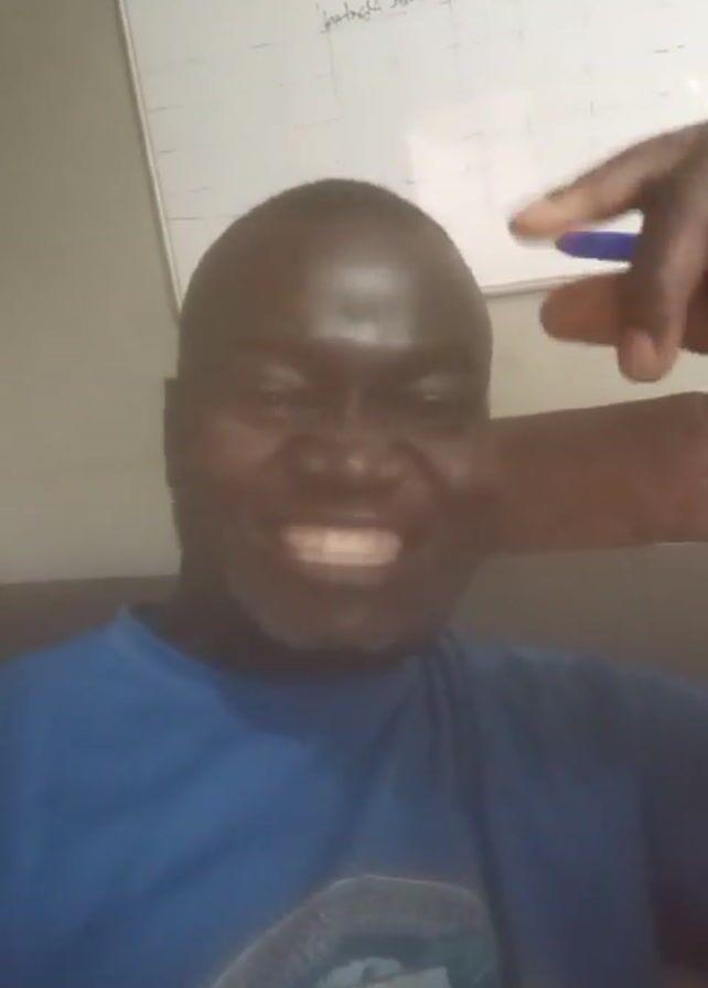 A man with dark skin and a shaved head is recording a close-up video of himself indoors. He wears a blue t-shirt with a logo visible on the lower front. He smiles briefly then makes an exaggerated surprised face with wide eyes and an open mouth. Behind him is a white board with some handwritten text. The video is handheld and slightly shaky.