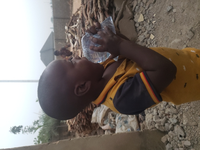 A young child drinks from a plastic water bottle. He wears a yellow shirt with navy blue sleeves trimmed with red and yellow stripes. Background elements include a pile of wood, a concrete wall, and loose gravel. A utility pole and other indistinct buildings are visible further in the background.