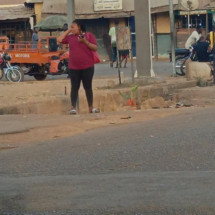 The scene depicts a street in Shendam, Nigeria. A paved asphalt road occupies the foreground, leading to an elevated, unpaved dirt and gravel shoulder. Centrally positioned on this shoulder is a woman with dark hair, wearing a maroon short-sleeved top, black leggings, and white-soled sandals with black straps. Her right hand is raised towards her temple, while her left hand holds a dark-colored smartphone. A red shoulder bag is visible over her left shoulder. To the woman's right, a dark gray utility pole stands. At its base, a small plant with reddish-orange flowers grows from the dirt. Scattered debris, including a single sandal, is present on the unpaved surface. In the background to the left, an orange three-wheeled commercial vehicle, bearing the label "MOTORS," is parked. A blue motorcycle is partially visible behind its front wheel. A person in a light blue shirt stands near the orange vehicle. Behind these vehicles are low-rise commercial buildings with corrugated metal roofs. Further right in the background, two individuals are seen walking or standing, one wearing a light green shirt. On the far right, a person in a white long-sleeved shirt is seated on a motorcycle, with another individual in a dark shirt standing adjacent. Additional commercial structures with illuminated interiors are visible further down the street. The ambient light suggests daytime conditions.