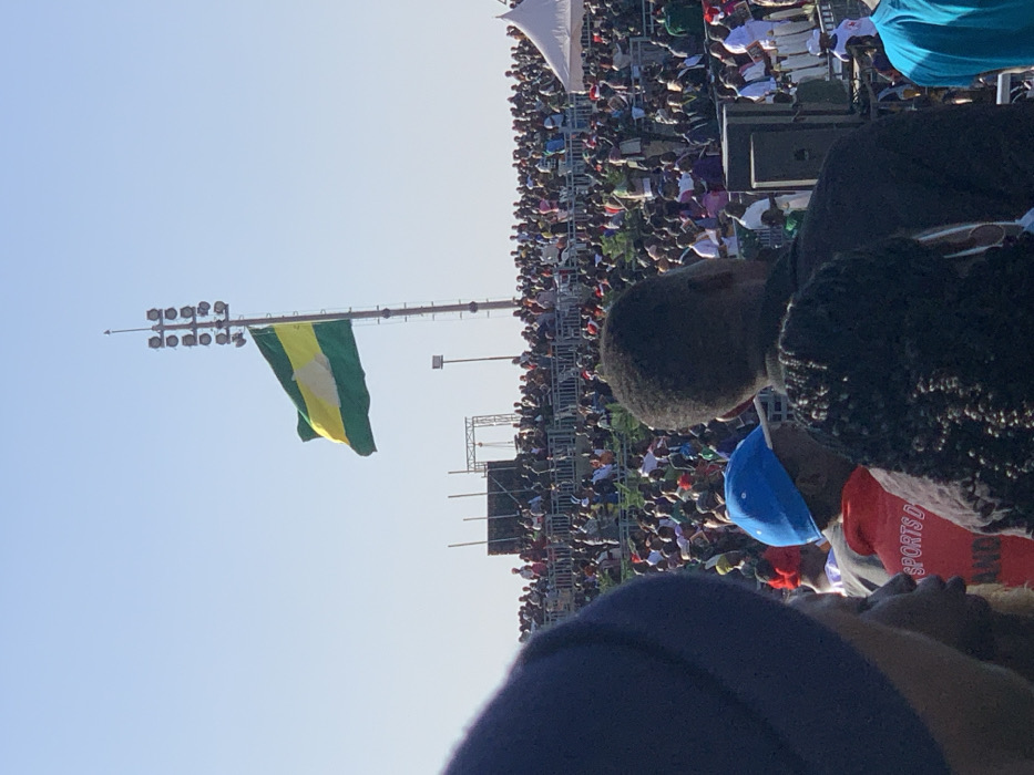 This outdoor image captures a densely populated stadium or arena in Kwang, Nigeria, under a clear, bright sky. A prominent, tall metal floodlight tower with multiple light fixtures stands in the middle-ground. A large flag is unfurled from near the top of this tower, displaying horizontal bands of green, yellow, and green, with a white starburst or sun-like emblem centered on the yellow stripe. Below the tower and flag, tiered seating is filled with a vast crowd of individuals, extending across the entire background. Structural elements, likely part of a stage or event setup, are visible in the mid-ground. A white canopy tent is positioned within the crowd on the right. In the foreground, several individuals are visible from behind: on the far left, a person wearing a dark beanie; in the center, a person with short dark hair and a dark top; to their right, a person with braided hair; and slightly further right, a person wearing a red shirt with "SPORTS D" visible on the back, topped with a blue baseball cap. The crowd appears to be observing an event.