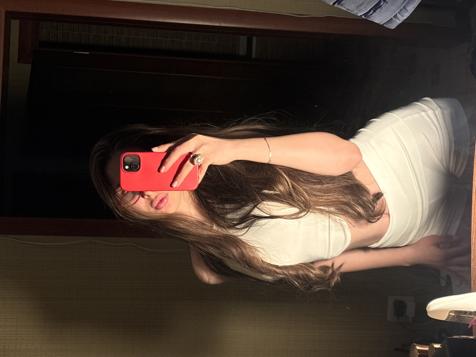 A female individual is depicted in a mirror reflection within an indoor room. She stands facing the mirror, holding a red-cased smartphone (appears to be an iPhone) in her right hand, which partially obscures her face. Her head is tilted, with pouted lips and a partial protrusion of the tongue. She wears red-framed glasses, a white sleeveless crop top, and white shorts. Long, wavy brown hair flows over her shoulders. Accessories include a prominent ring with a large white, pearl-like stone on her right ring finger, and a thin, gold-colored bracelet on her right wrist. Her left hand rests on a surface below the mirror. The background consists of a light brown, textured wall with an electrical outlet to the viewer's left, and a dark, open doorway or passage to the right. Several indistinct objects, including a white container and other items, are visible on the surface below the mirror. A piece of striped fabric, possibly blue and white, is partially reflected on the far right. The scene is illuminated by a strong, warm, directional light source, creating high contrast and deep shadows. No specific location within the city of Krasnodar, Russia, is discernible from the visual evidence.