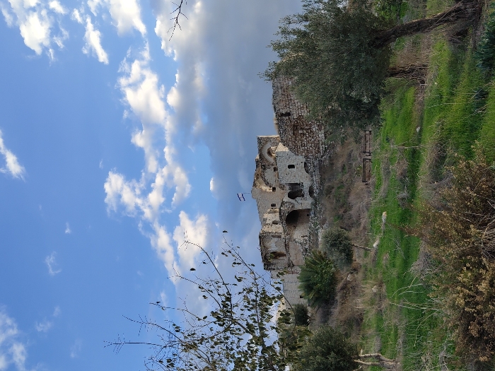 A weathered stone building rests atop a green hill