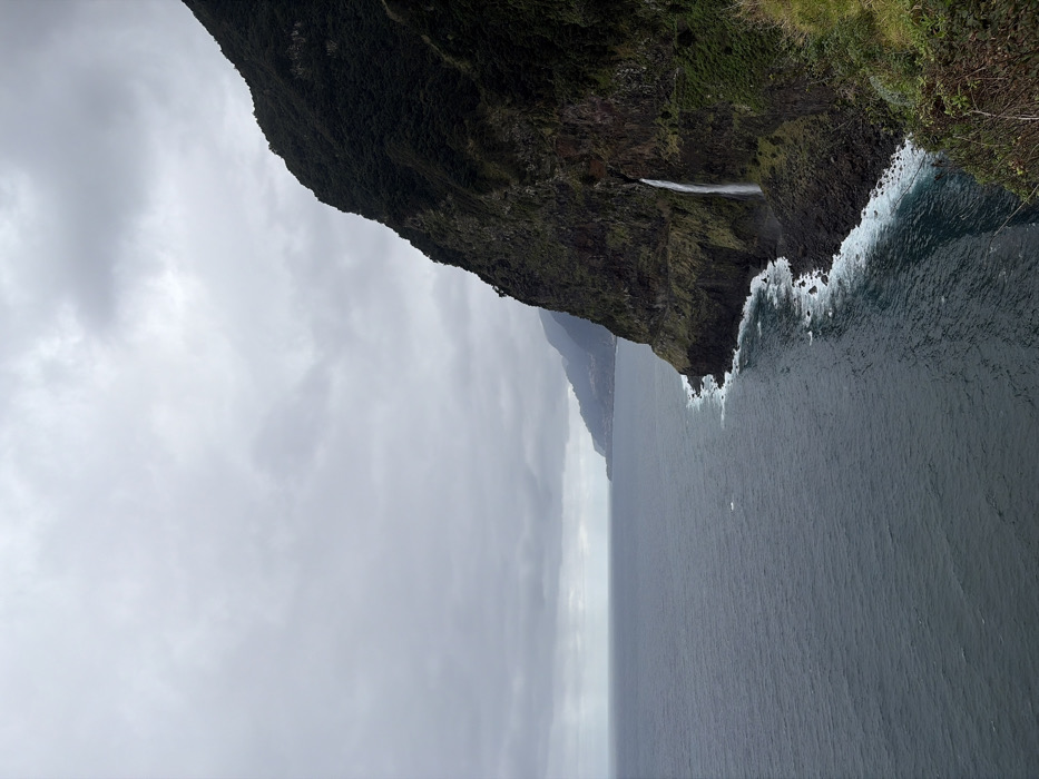 The image displays a rugged coastal landscape near Porto Moniz, Portugal, under an overcast sky. A vast expanse of dark blue-grey ocean occupies the left and central portions of the frame. To the right, a steep, dark cliff face, densely covered in green vegetation, rises from the water. Approximately one-third from the right edge, a narrow, vertical waterfall cascades down the cliff, impacting the rocky shoreline and dissipating into the sea. White foam from ocean waves is visible crashing against the base of the cliff and the dark, stony beach. In the distance, along the coastline stretching leftward, further mountainous terrain and subtle hints of structures are visible beneath the uniformly grey clouds. The immediate foreground on the lower right shows green foliage and dark earth, indicating an elevated vantage point. No individuals are present.