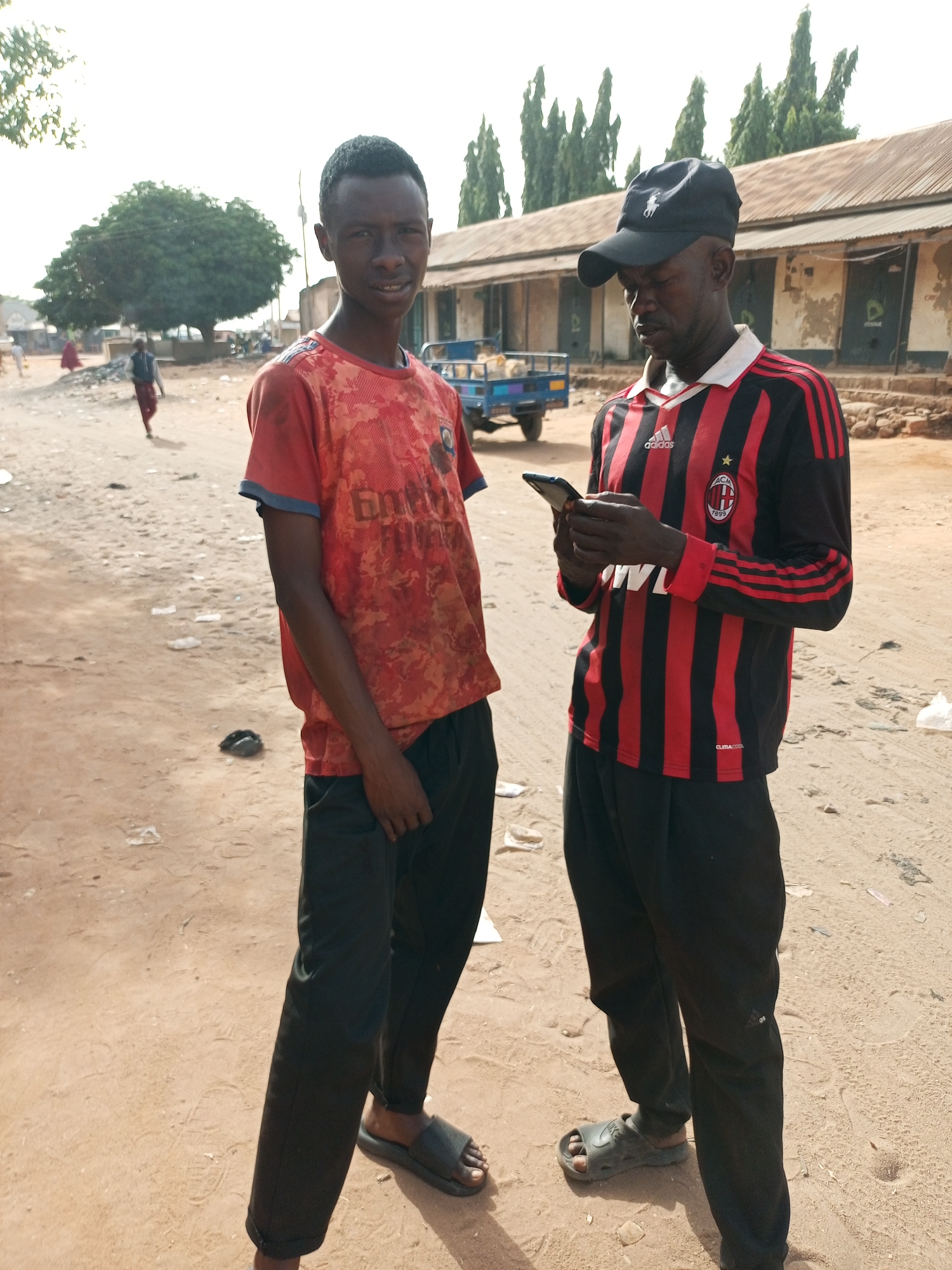 This image depicts an outdoor scene in the city of Gombe, Nigeria, characterized by an unpaved, sandy-dirt ground under hazy daylight. In the foreground, two adult males of African descent are standing. The male on the left, appearing younger, wears a red and orange camouflage-patterned short-sleeved t-shirt with blue trim, black athletic pants, and dark grey slide sandals. He stands facing the viewer with a slight smile. The male on the right, appearing older, wears a black baseball cap with a white Polo Ralph Lauren logo, a red and black striped long-sleeved Adidas AC Milan jersey, black pants, and dark grey Crocs-style sandals. He is actively engaged with a black smartphone, holding it with both hands and looking down at the screen. The immediate ground around them is light brown, dusty, and contains scattered small pieces of white plastic litter and debris. In the mid-ground, a blue utility vehicle with a metal cargo frame is partially visible behind the left male. Further back, a long, single-story building with a corrugated metal roof extends across the frame. Its walls appear light-colored and show signs of wear, featuring multiple door openings; one door prominently displays an "etisalat" logo, confirming the Nigerian context. Behind the building, several tall, slender, coniferous-like trees are visible. To the left of the building, a large, dense green tree stands prominently. In the distant background, several indistinct figures are visible, including one person in red clothing. The sky is bright and appears hazy.