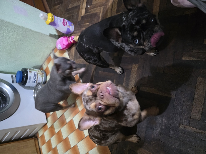 The scene depicts three French Bulldog-type dogs in an indoor setting located in Dupnitsa, Bulgaria