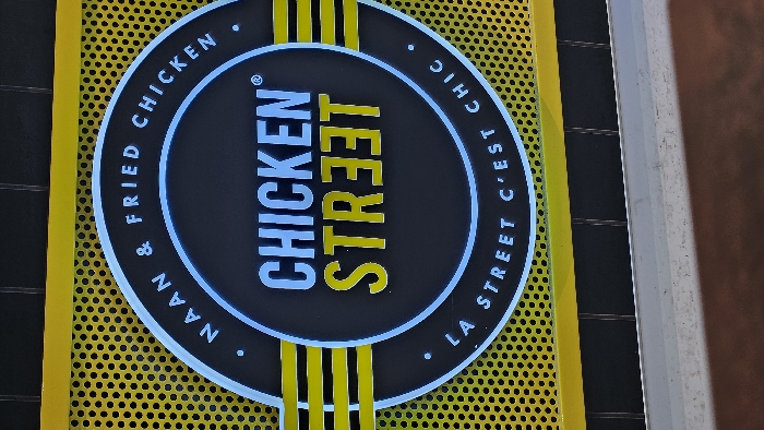 Chicken Street sign. The logo is a black circle with "CHICKEN" stacked on top of "STREET" in different colors and fonts. "CHICKEN" is a pale blue, and "STREET" is gold. Encircling this is the pale blue text: "NAAN & FRIED CHICKEN • LA STREET C'EST CHIC •". The background is a bright yellow perforated surface with thick vertical gold stripes. The rest of the sign is framed in black, but the right side is obscured by a grey surface and a partially visible brown area.