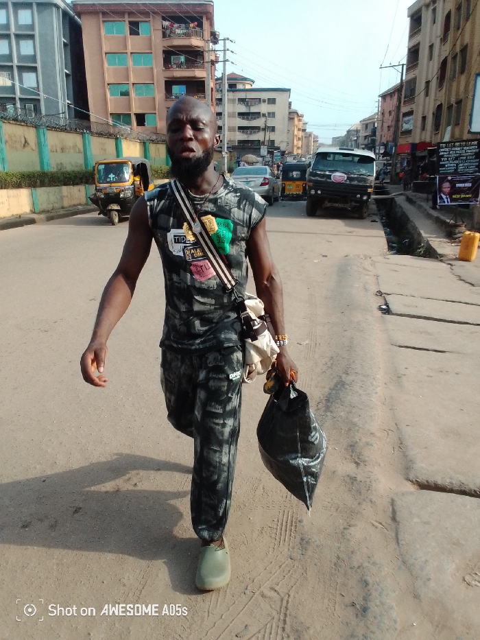 A man walks down a busy city street, wearing a camouflage shirt and matching pants. He carries a black plastic bag in one hand and a small purse over his shoulder. Behind him, yellow tricycle cars and trucks populate the road, lined with multi-story buildings. The road surface is uneven and shows signs of wear. A drainage ditch runs alongside the sidewalk. The sky is clear, suggesting a sunny day.