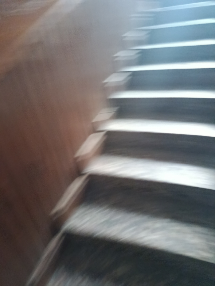 An indoor staircase is depicted ascending from the lower-left foreground to the upper-right background, located within an unspecified building in Warri, Nigeria. The image exhibits significant motion blur. The staircase features multiple visible steps with dark-toned, possibly granular treads, contrasted by lighter-colored risers or leading edges. A solid, reddish-brown wall or banister structure runs parallel to the stairs on the left. Illumination appears to be ambient, originating from the upper-right, highlighting portions of the steps. No people, specific objects beyond the staircase and wall, or discernible actions are present.