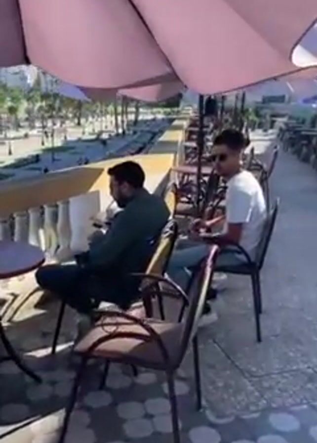Two men are sitting at an outdoor cafe. One man is wearing a white t-shirt and jeans, and sunglasses. He is sitting at a table with food and drinks on it. The other man is wearing a green shirt and is looking at his phone. The cafe has a view of a park and the city. There are several tables and chairs, and pink umbrellas providing shade. The floor is tiled in a checkered pattern.