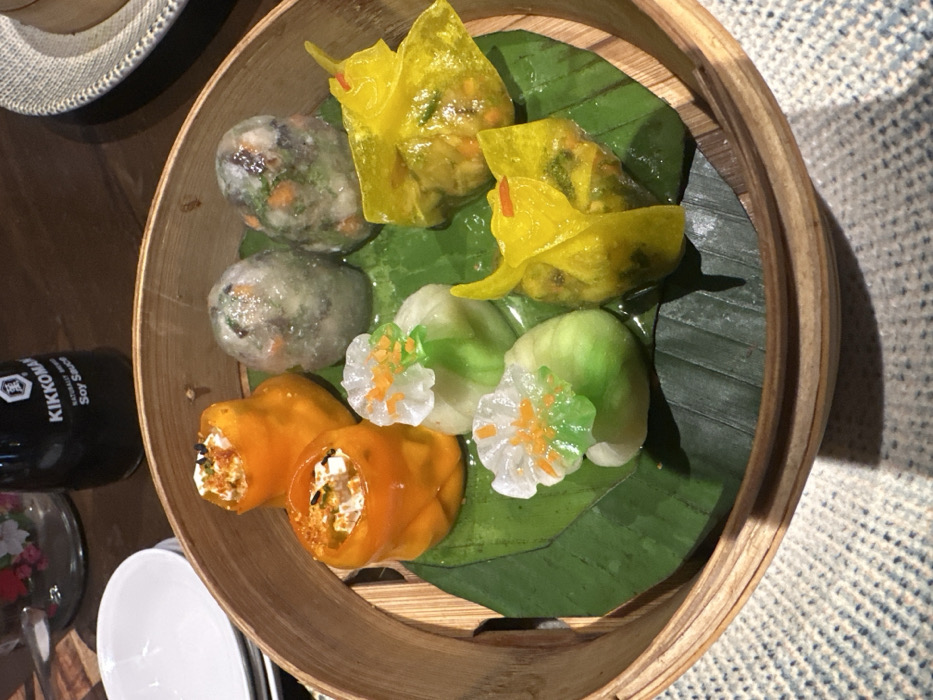 This image presents a close-up, slightly elevated view of eight gourmet dim sum items arranged within a round, light-colored bamboo steamer basket. The basket rests on a patterned placemat or tablecloth, with elements of a wooden table visible. Inside the steamer, a large, dark green banana leaf serves as a liner for the dumplings. The assortment of dim sum includes: 1. **Two orange-colored dumplings:** Positioned on the left, these are cylindrical with open tops, revealing a white filling garnished with small orange/red specks and black sesame seeds. 2. **Two translucent grey-green dumplings:** Located in the upper center, these are oval-shaped, with the semi-transparent wrapper allowing visibility of a speckled internal filling containing green and orange components. 3. **Two light green dumplings with white flower-shaped tops:** Situated in the lower center, these feature a solid light green base, topped with a delicate, translucent white wrapper sculpted to resemble a flower, adorned with small orange garnish. 4. **Two yellow pouch-shaped dumplings:** Placed on the right, these are irregularly shaped, wrapped in a thin, translucent yellow dough, with some darker green filling visible through the wrapper and a small red element at the pinched top. In the background, to the left of the steamer, a stack of white ceramic bowls is partially visible. Centered behind the steamer is a black bottle of Kikkoman Naturally Brewed Soy Sauce. To the far right, part of a grey and white textured plate or bowl is visible. The lighting suggests an indoor setting, likely an upscale restaurant. The specific location in Mumbai, India, cannot be identified from the visual evidence; however, the presentation and cuisine are characteristic of high-end Asian dining establishments found within the city.