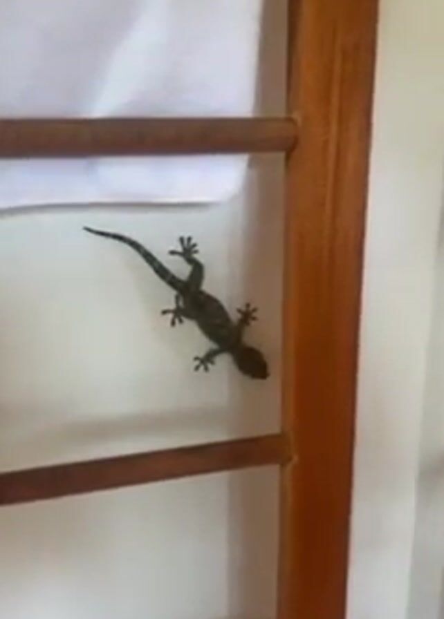 A short, shaky video shows a gecko on the wall next to a wooden towel rack