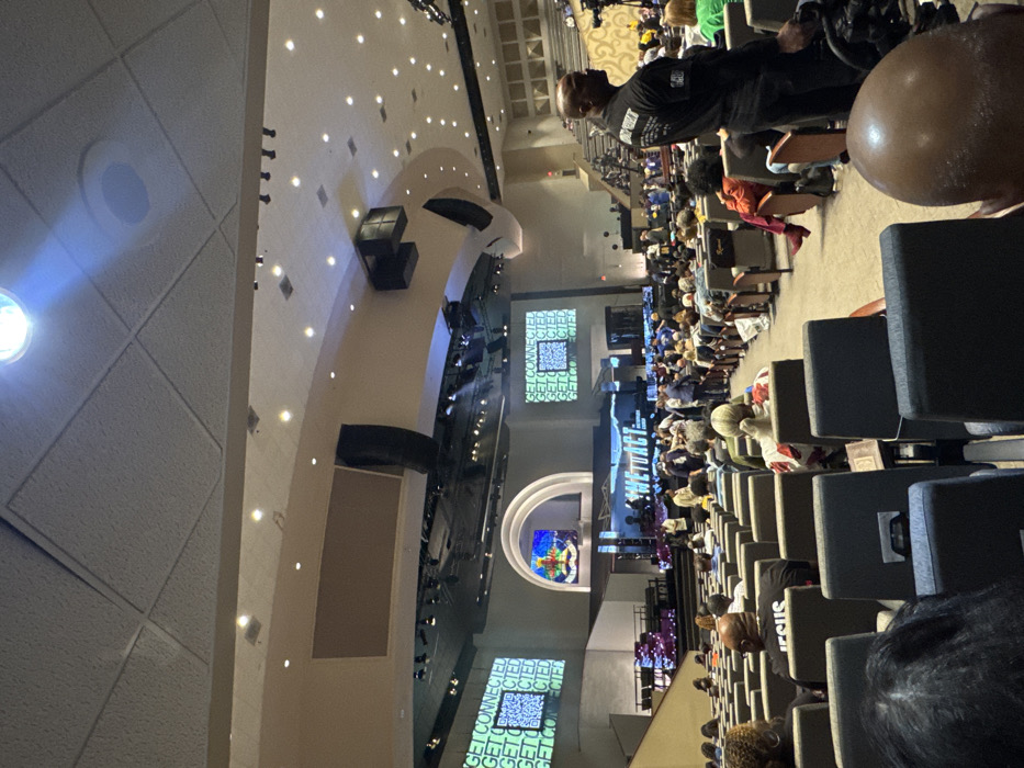 A large auditorium is filled with seated attendees facing a stage. Several large screens flank the stage, displaying "GET CONNECTED" and QR codes. A central arched structure frames a vibrant stained glass window. The lighting is bright with many spotlights. Several speakers are visible along the walls. The seating extends deep into the auditorium. The image is taken from a slightly elevated perspective within the crowd.