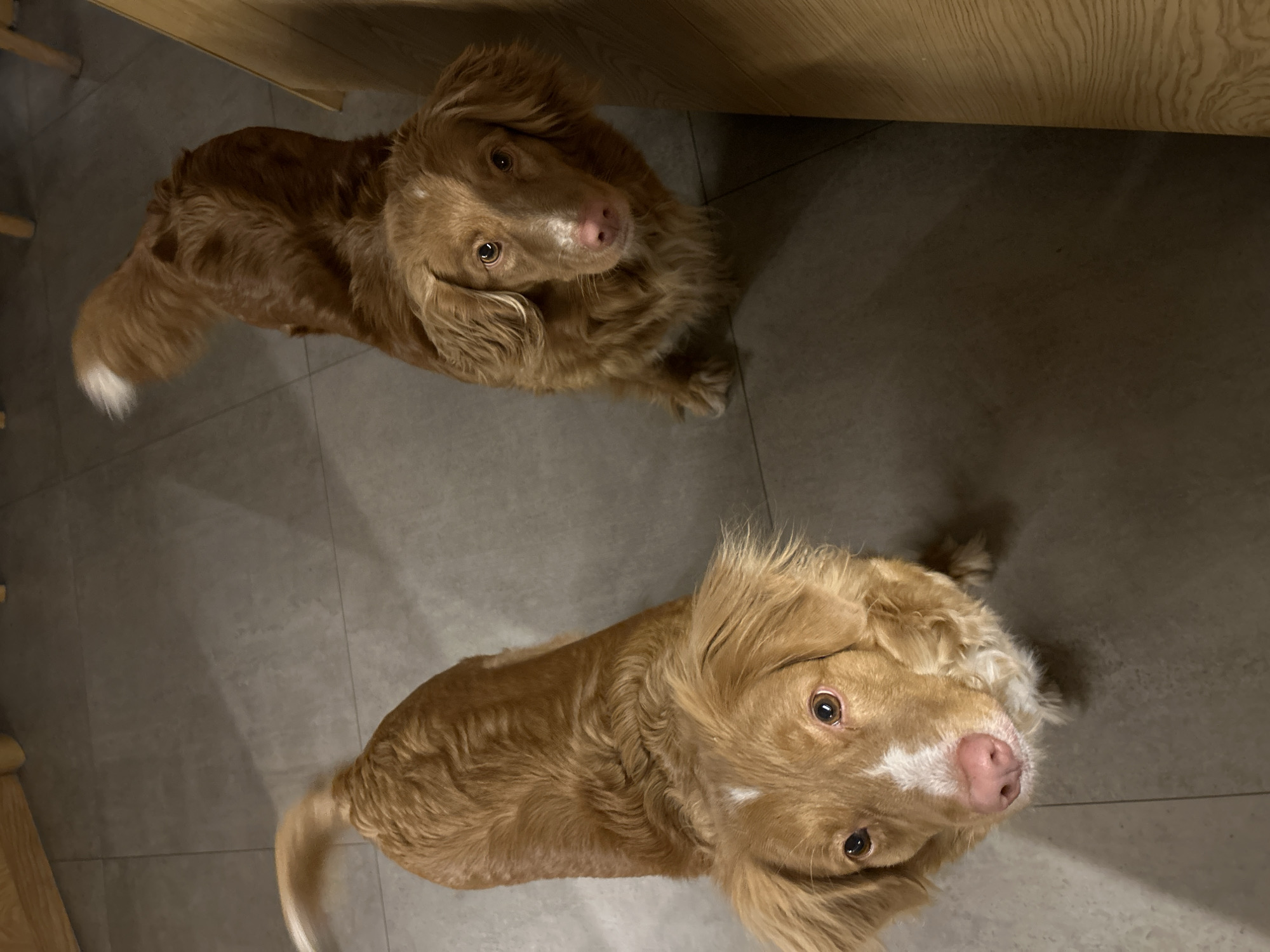 An overhead-angle image captures two Nova Scotia Duck Tolling Retriever-type dogs indoors in Riga, Latvia. The floor is composed of large, light grey rectangular tiles with darker grout lines, partially shadowed. On the left, one dog with golden-reddish brown, wavy fur, a distinct white blaze on its forehead, and a pink nose, looks directly upwards at the camera. Its front paws are not visible. On the right, a second dog of similar appearance, also with golden-reddish brown fur and a less prominent white marking on its snout, stands with its body angled slightly away, also looking upwards. Its fluffy tail, which has a white tip, is blurred, indicating motion. A light-colored wooden object, possibly furniture, is partially visible on the right edge of the frame. Both dogs exhibit an attentive posture, focused on an unseen entity above the camera's perspective.