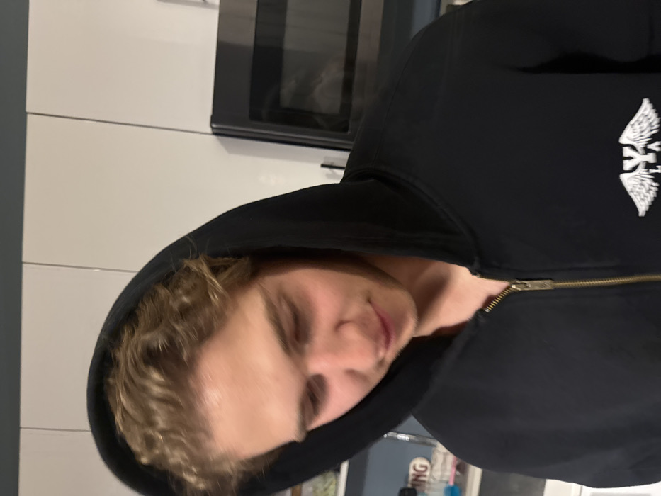 A young male individual with light-colored, wavy hair is depicted indoors in what appears to be a kitchen in Gainesville, United States of America. He is wearing a black hooded sweatshirt with the hood drawn over his head, featuring a brass-colored zipper and a white winged emblem on the left chest. His head is tilted downwards, and his gaze is directed below the camera's field of view, with a subtle smile present. The background includes white, flat-panel upper cabinets and a dark-colored microwave oven or wall oven on the right. To the left, behind the subject, a shelf or counter holds an object with partially visible white text.