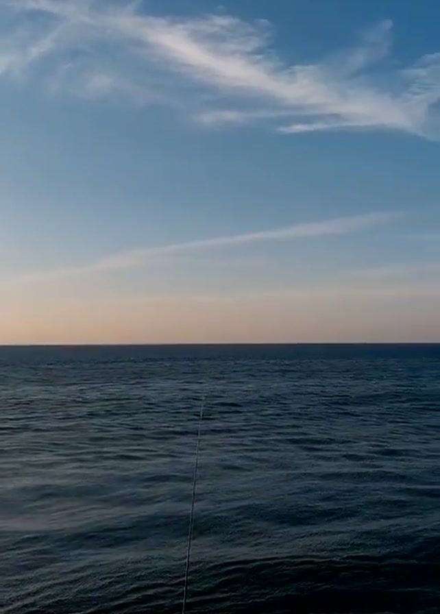 wide shot of an ocean with small waves. In the distance, barely visible, are mountain ranges. The sky is blue with some sparse clouds. A fishing rod is seen in the right foreground, and some green shrubs are visible on the right. The camera pans slowly, revealing more of the mountain ranges in the distance. Music plays softly in the background.