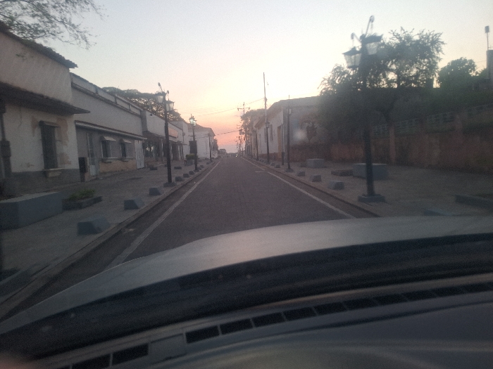 The image displays a long, straight urban street in San Carlos, Venezuela, captured from the interior perspective of a vehicle looking forward through the windshield. The time of day is either dusk or dawn, indicated by a faint orange and pink gradient in the sky, transitioning to lighter hues overhead. The dark gray dashboard of the vehicle, featuring air vents, occupies the lower foreground, with a portion of a hand visible in the bottom-left corner. The asphalt road extends centrally into the distance and appears clear of traffic. Both sides of the street are bordered by sidewalks. Along these sidewalks, ornate black streetlights with multiple lanterns are regularly spaced, and dark gray rectangular concrete blocks, some containing small plants, are positioned as planters or bollards. On the left side of the street, a continuous row of predominantly single-story, light-colored buildings with flat roofs lines the sidewalk. These structures exhibit signs of age, with some windows and doorways appearing closed or boarded. On the right side, a long, textured, earth-toned wall runs parallel to the sidewalk, behind which dense green foliage and trees are visible. Further down the street, additional buildings are discernible on both the left and right sides. A utility pole with overhead wires is present on the left side of the street. No individuals or active interactions are visible within the scene.