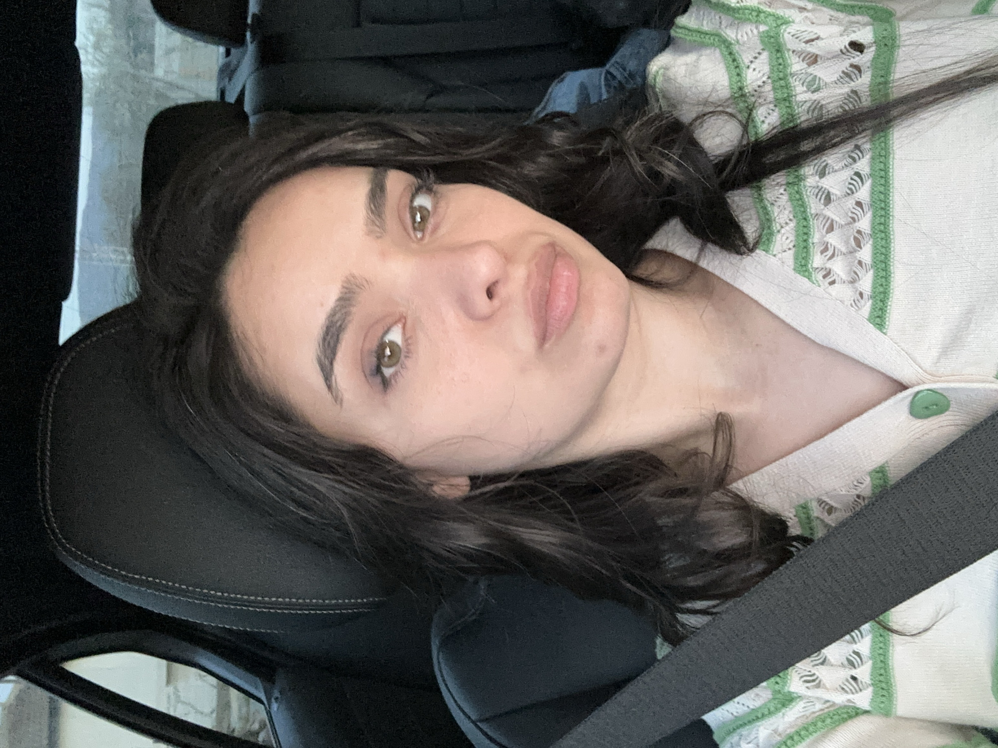 A woman is seated in a car. She has dark hair and is wearing a white and green sweater. A seatbelt is fastened across her chest. The car seat headrest is visible behind her head. The location is not determinable as Kirkovo, Bulgaria, from the image content.