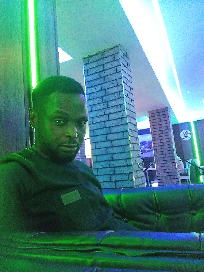 A man sits on a dark leather sofa in a modern interior. The lighting is a mix of green and blue hues, casting a glow on his face and clothing. Behind him, brick-like columns add texture to the space. A bright green neon light accents the wall. He is wearing a dark-colored shirt with a small, square detail on the chest. The overall atmosphere is contemporary and stylish, with a cool color palette.