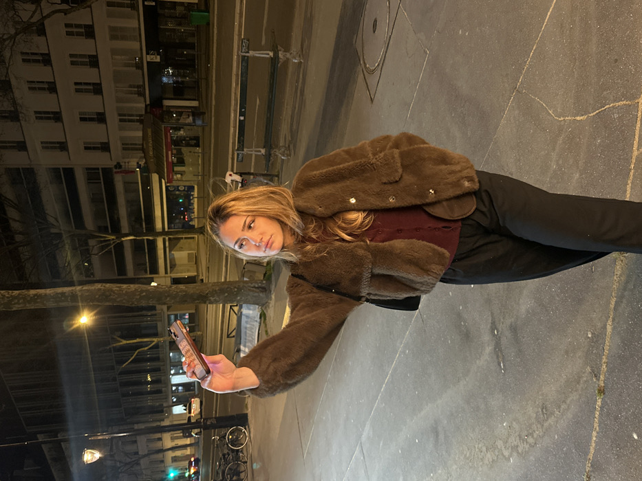 A young adult female with long, light brown hair stands on a sidewalk at night in Paris, France