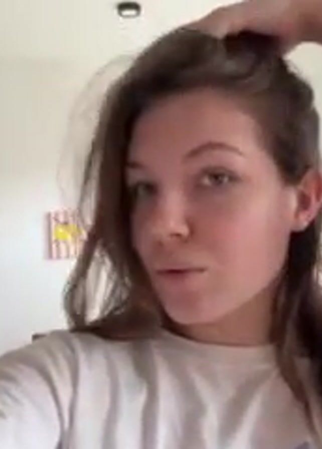 A woman with long brown hair is standing in a room. She's wearing a white t-shirt. She is playing with her hair, moving it around her face and behind her ears. In the background, there is a kitchen area with red cabinets, a table and chairs, a computer monitor, a houseplant, and framed pictures on the wall. The room appears to be a living space, possibly an apartment. The lighting is bright. Electronic music is playing.