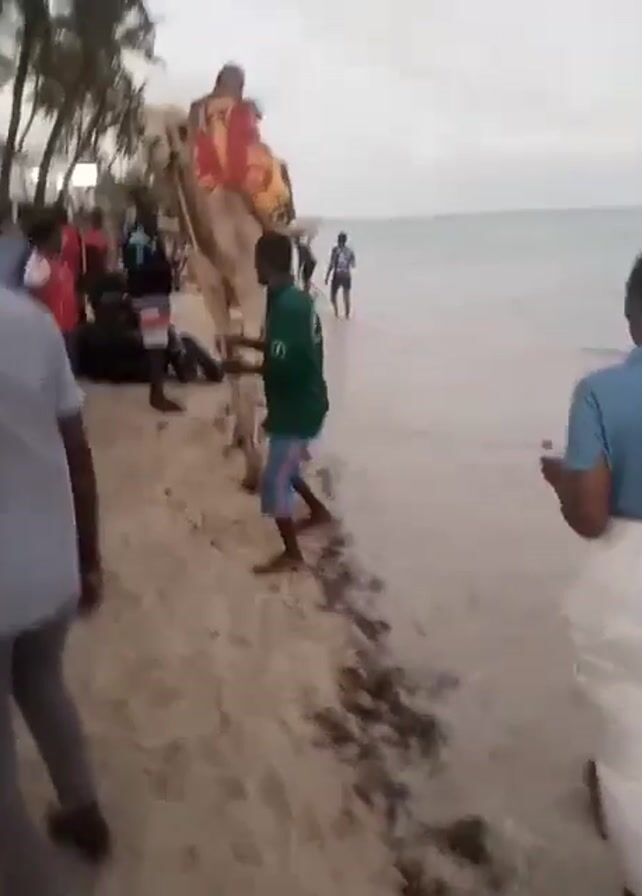 On a sandy beach, a camel with two children riding on its back is being led by a man in a green shirt and blue shorts. The camel is adorned with a red and yellow patterned cloth. Several other people are present on the beach, some walking along the shoreline and others standing in groups. The sky is overcast and palm trees are visible in the background. The ocean is calm.