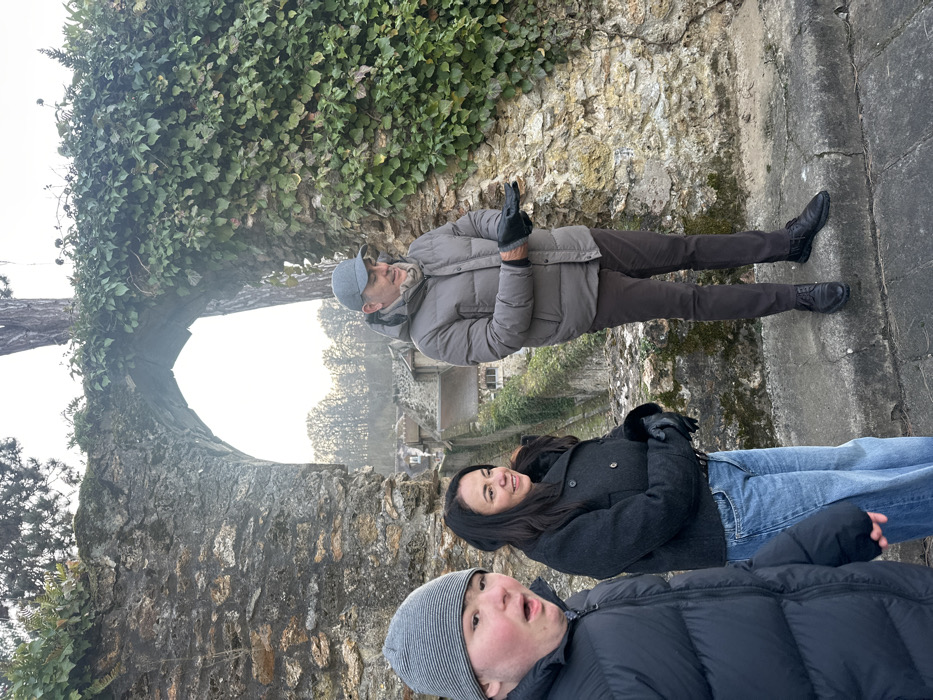 Three people pose against a stone structure partially covered with ivy. The woman in the middle wears a gray coat and jeans. The man above her wears a gray puffer jacket, brown pants, gloves, and a gray cap. The person at the bottom wears a black puffer jacket and a gray knit hat. In the background, there is a blurry view of buildings and trees. The image is rotated counterclockwise.