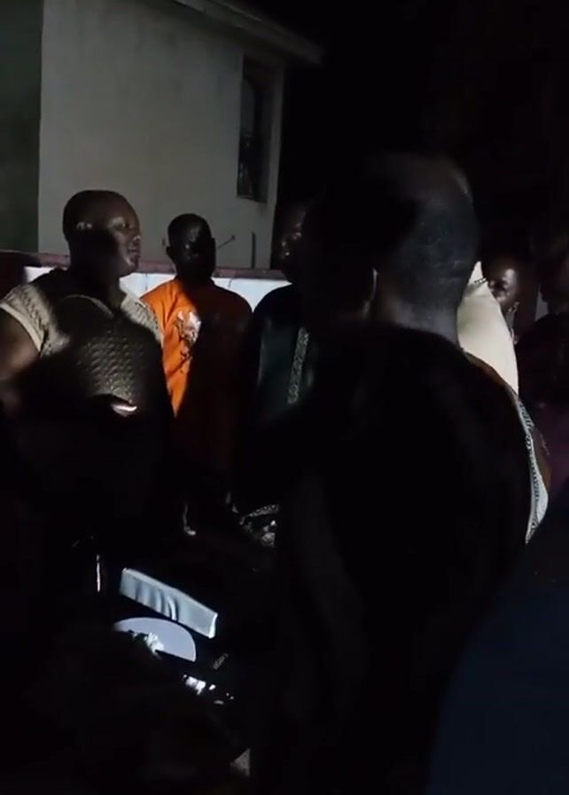 A group of people is gathered outside a building at night. The scene is dimly lit. Several individuals are partially visible, including one wearing an orange shirt. The group appears to be celebrating, as “Happy Birthday” is being sung.