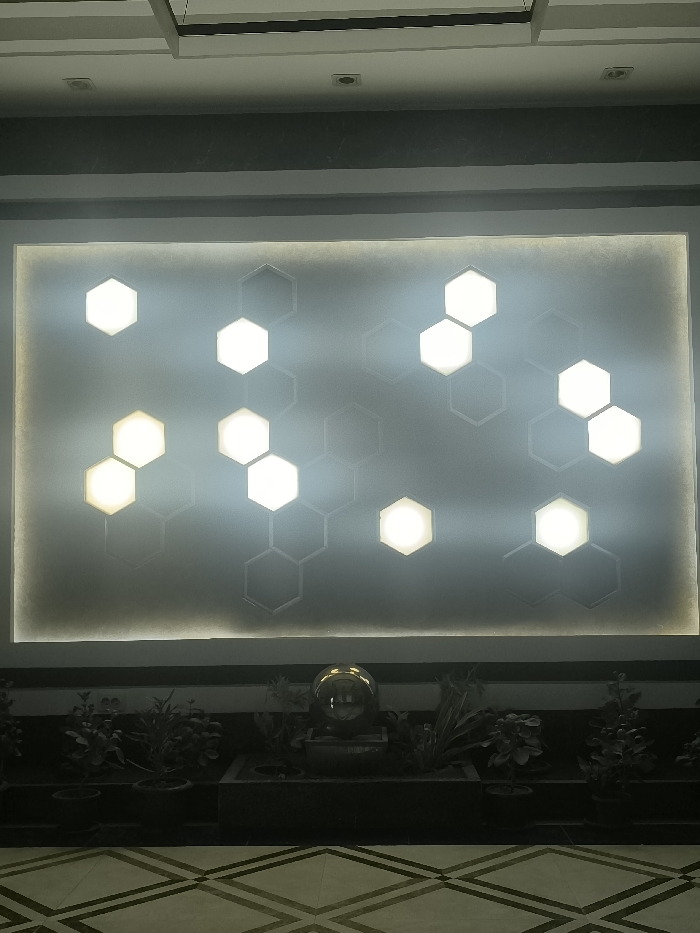 A contemporary wall art piece features a light gray background with a pattern of white hexagon shapes. Some hexagons are illuminated with a warm light, creating a honeycomb-like effect. Below the artwork is a dark ledge adorned with various potted plants. A golden decorative sphere sits in the center, adding a touch of elegance. The floor in the foreground is patterned with contrasting light and dark squares, giving a sense of depth.