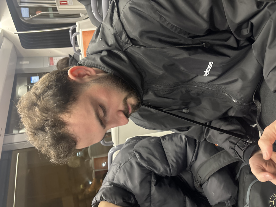 The scene is set within a public transport vehicle, consistent with a tram or train carriage, at night in the city of Hoenheim, France. In the foreground, a male individual is seated, characterized by light brown, curly hair and a short beard. He is looking downwards, directing his gaze towards something out of frame. He wears a black, hooded, windbreaker-style jacket with the word "belcase" printed in white on the left chest. A black strap, possibly from a bag or an accessory, hangs vertically across his torso. To his left, partially visible, another individual wears a black puffer jacket, with only their left shoulder and upper arm in the frame. The interior environment features white and light gray panels, with orange and white seating visible in the background, alongside silver-colored grab handles. A large window on the left reveals blurred urban lights, indicating movement during nighttime. Further down the carriage, a third passenger is discernible from behind. The overhead lighting illuminates the interior.