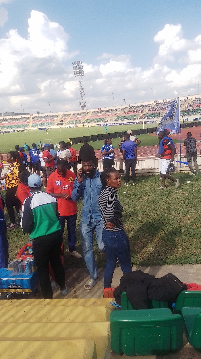 The scene depicts an outdoor daytime view of the Moi International Sports Centre Kasarani stadium in Nairobi, Kenya, under a partially cloudy sky. In the immediate foreground, yellow concrete steps are visible. To the right, green plastic stadium seats are present, with dark clothing draped over one. On the left, a blue carton, possibly containing beverages as cans are visible, rests on the ground near the steps. The mid-ground features approximately twenty individuals standing on a green grass area. A bearded man, dressed in a denim shirt and jeans with light-colored slides, is speaking on a black mobile phone. Beside him, a woman wearing a black and white striped long-sleeve top and blue jeans is looking intently towards the right. Another man, in a red polo shirt with an 'AFC LEOPARDS' logo, is looking down at a mobile device. A person with their back to the viewer wears a green and white jacket. Most individuals are dressed casually, standing or conversing. The background shows a football match underway on a green pitch, with players in light-colored kits. A running track surrounds the pitch. The stadium's multi-tiered stands, featuring a pattern of green, red, and beige seats, are partially occupied by spectators. Advertising hoardings line the pitch boundary. A prominent tall, metal floodlight tower is visible against the sky on the left, and a blue flag with white text is present near the pitch on the right.