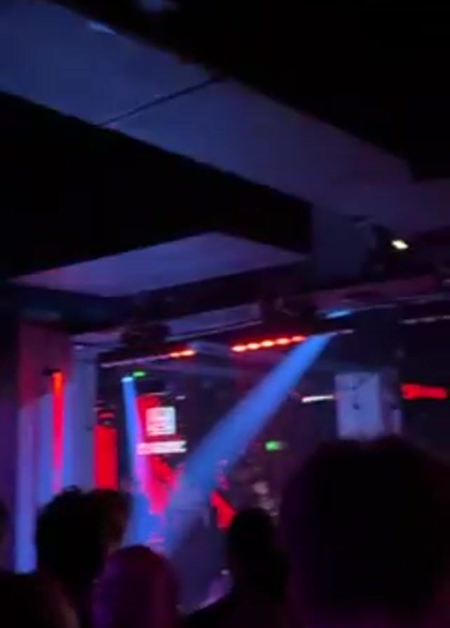 nightclub setting, with a crowd of people in the foreground and stage lights and a DJ in the background. The lighting is a mix of red and blue, creating a dark and energetic atmosphere. The camera moves slightly, capturing the silhouettes of people in the crowd and the lights flashing on stage.