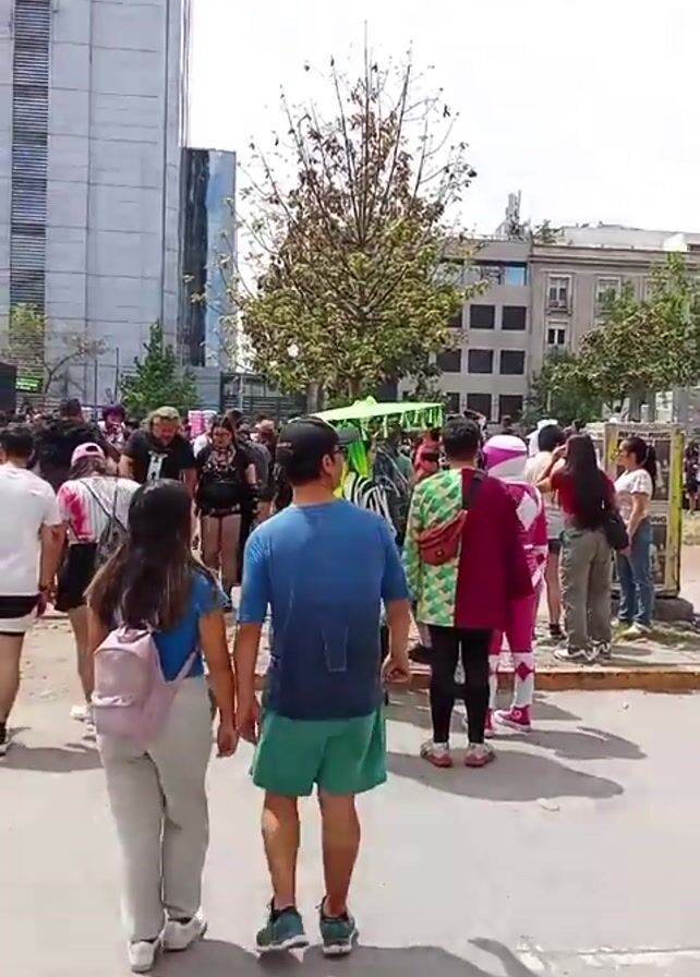 street scene with a large crowd of people gathered. Many of the people are wearing costumes or colorful clothing, suggesting a festive event or parade. The crowd is dispersed across the street and sidewalks. Some people are walking, others are standing and talking, and some are taking pictures. The environment includes modern buildings, trees, construction cranes, traffic lights, and a few small vendor stalls. The overall atmosphere is lively and crowded.