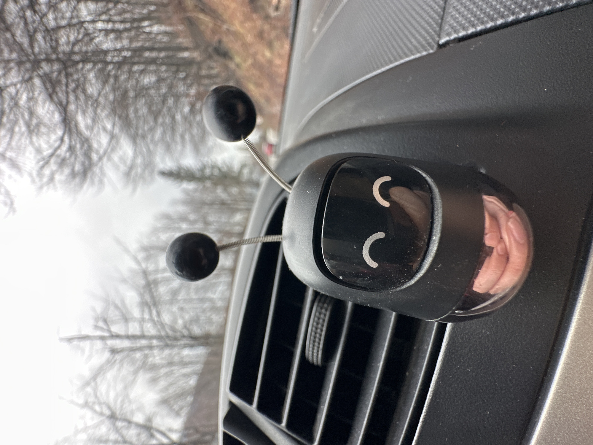 The scene depicts the interior of a vehicle dashboard extending to an exterior landscape. A black, stylized car air freshener, designed with two spring-mounted spherical antennae topped with black spheres and a reflective dark face featuring a white smiling mouth graphic, is centrally positioned in the foreground. Its lower section is translucent, revealing a crumpled pink substance. The air freshener is situated on the vehicle's dark grey dashboard, to the right of a black multi-slatted air vent and a ribbed circular control knob. Reflections of human fingers are visible on the air freshener's reflective surface. Through the vehicle's windshield, an asphalt road is visible, curving to the right and leading towards a distant red vehicle. The surrounding environment consists of a dense wooded area with predominantly bare deciduous trees and some evergreen trees, indicative of a cool season, with brown ground foliage on a rising embankment to the right. The sky is uniformly overcast. This scene is located on a road within the vicinity of Barziya, Bulgaria.