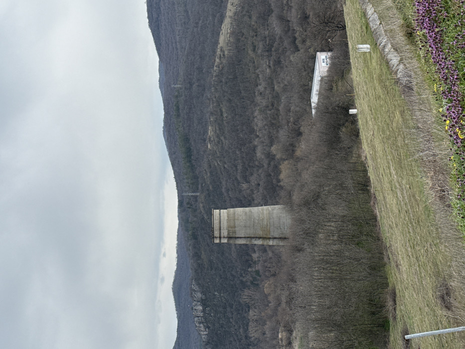 An outdoor scene captured near the city of Баня, Bulgaria, depicts a landscape under an overcast sky. In the midground, a tall, weathered concrete tower, cylindrical and slightly tapered, stands amidst a dense cluster of bare deciduous trees and shrubs. To the right of the tower and lower on the slope, a white, rectangular structure, possibly a container or portable building, is partially visible, bearing the Cyrillic text "БЪД КРЕХЪК!!!" ("BE FRAGILE!!!") on its side. The background features rolling hills and mountains covered in leafless, dark-branched trees, with several lattice-structured power line pylons visible on the slopes and some rocky outcrops on the left. The foreground consists of a grassy slope, predominantly light green and brown, with patches of purple and yellow wildflowers in the bottom right corner. A concrete drainage ditch runs diagonally through the right foreground, and two white, rectangular markers are positioned on the grassy bank above the ditch. A thin, light-colored pole is partially visible on the far left edge of the foreground. No individuals, discernible actions, or interactions are present in the image.